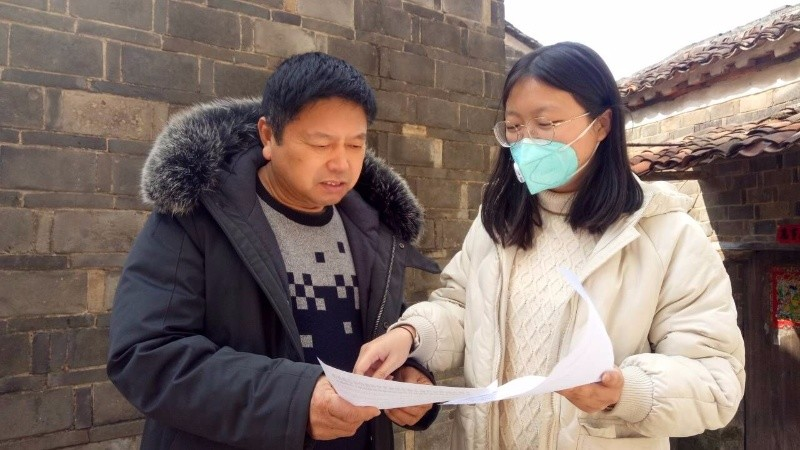 张娜敏同学在工作岗位上记录进出村庄的人员信息