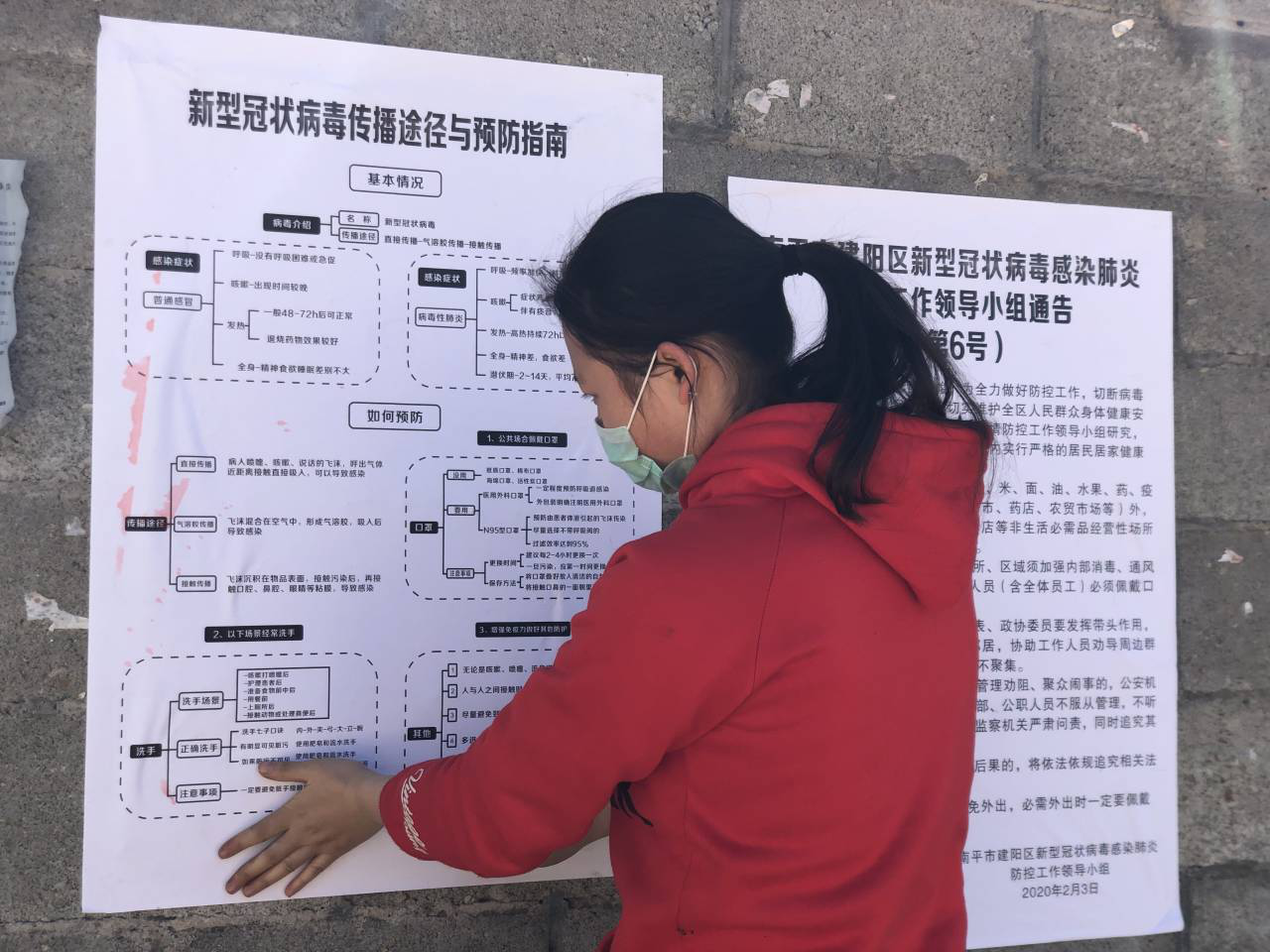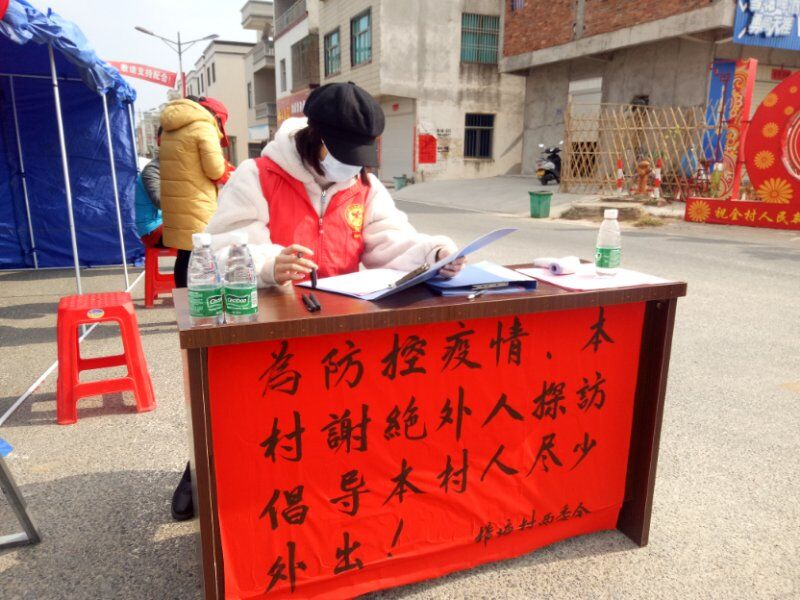 在江西省丰城市白土镇寺前村,2016级生物制药专业的徐佳同学在村里忙碌着:每三日一次在村里留出的路口进行留守,检查进出入村的人员信息,避免外来人员进村;在村里张贴防疫口号,号召大家勿信谣言。