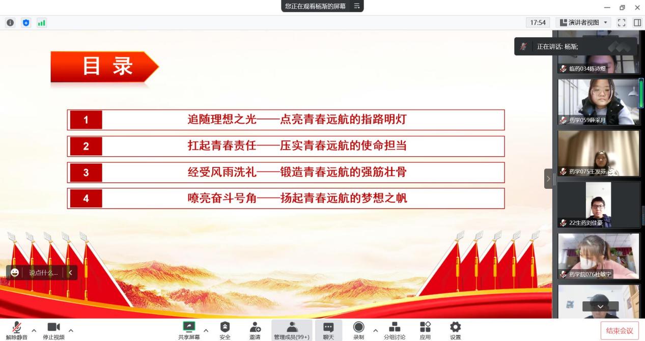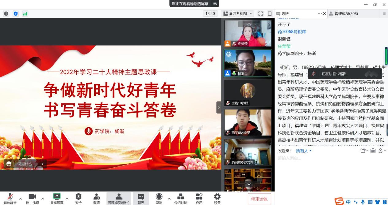 2022年12月17日,william威廉中文官网副经理杨渐在线上为2022级本科生上了一堂以《争做新时代好青年,书写青春奋斗答卷》为题的学习贯彻党的二十大精神主题思政课。杨渐副经理结合《健康中国2030》和医员工人才培养目标,从如何认识党的二十大胜利召开的重要意义到广大青年自觉扛起青春大旗的使命担当、从新时代如何练就过硬本领到新青年坚定理想报效祖国四个层面,向同学们做了党的二十大精神宣讲,他勉励同学们立足当下,学好知识,锤炼品格,做有理想、敢担当、肯奋斗的新时代好青年。(学工办供稿)