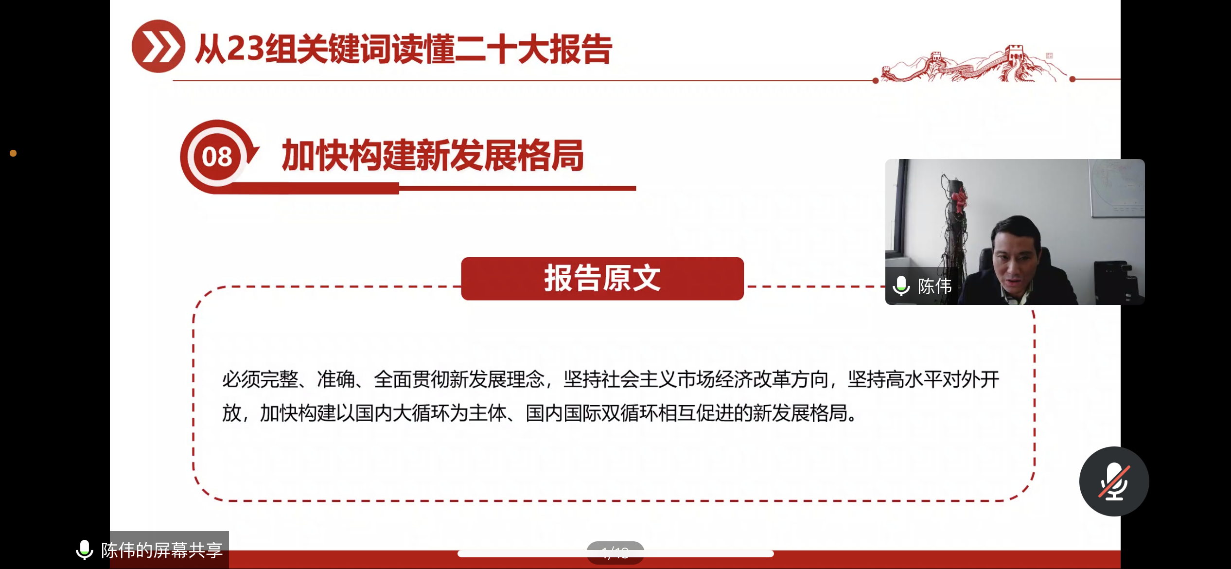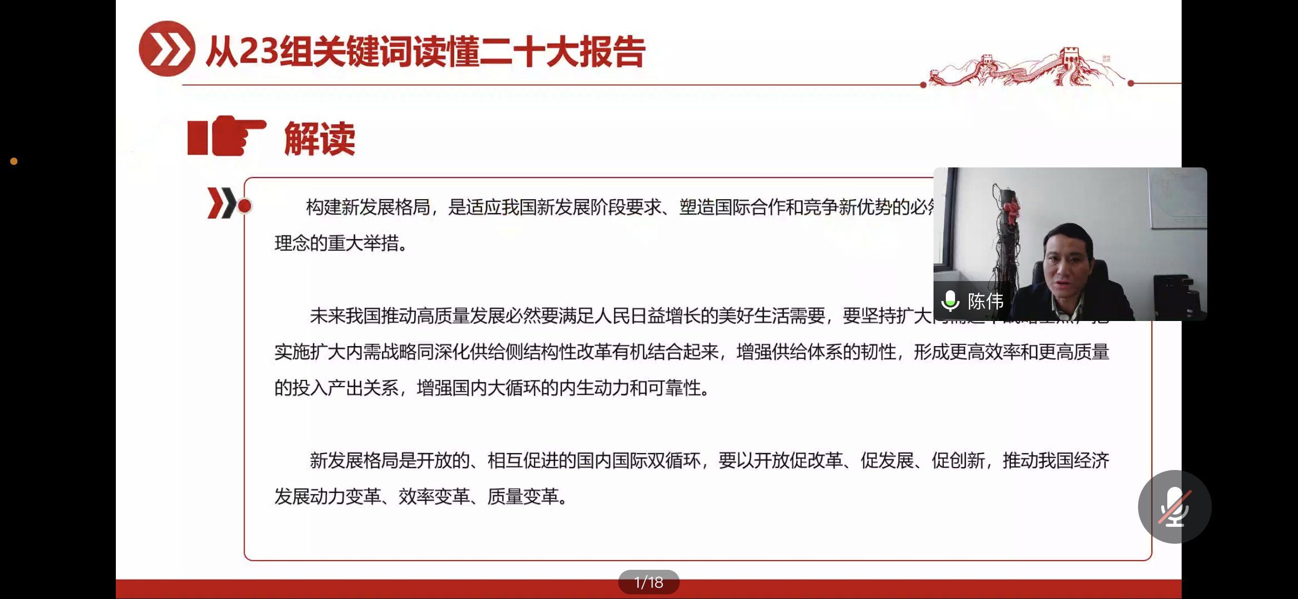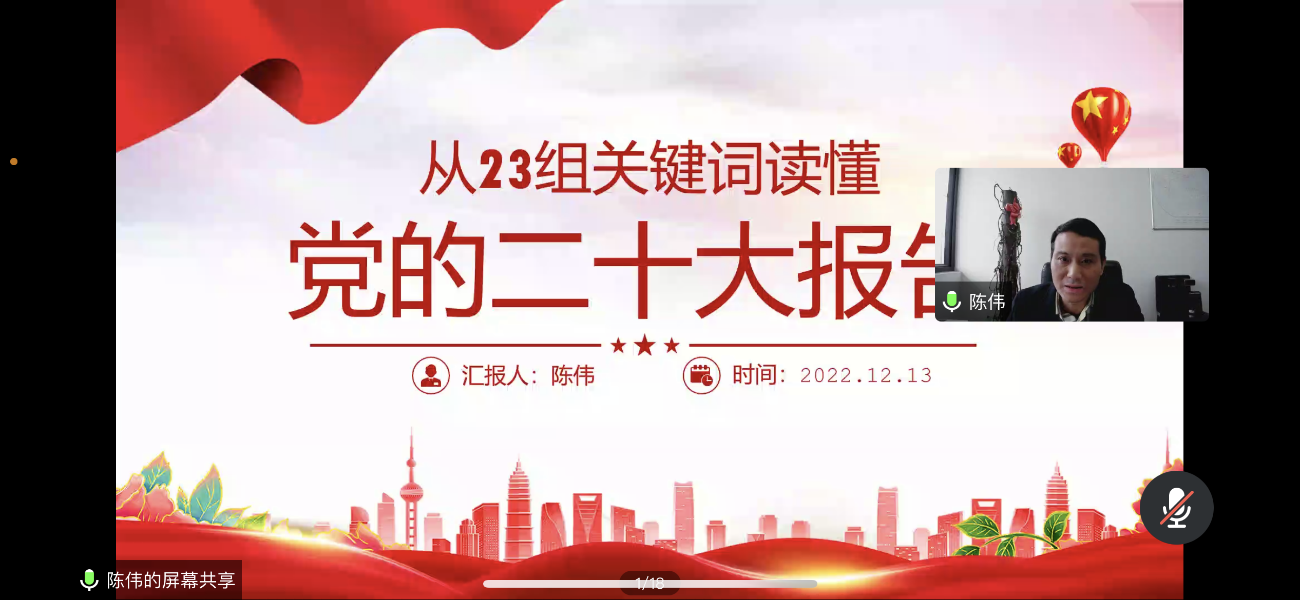2022年12月13日,公司党委书记陈伟通过腾讯会议平台,线上为2021级研究生上了一堂以《从关键词读懂党的二十大报告》为题的学习贯彻党的二十大精神主题思政课。